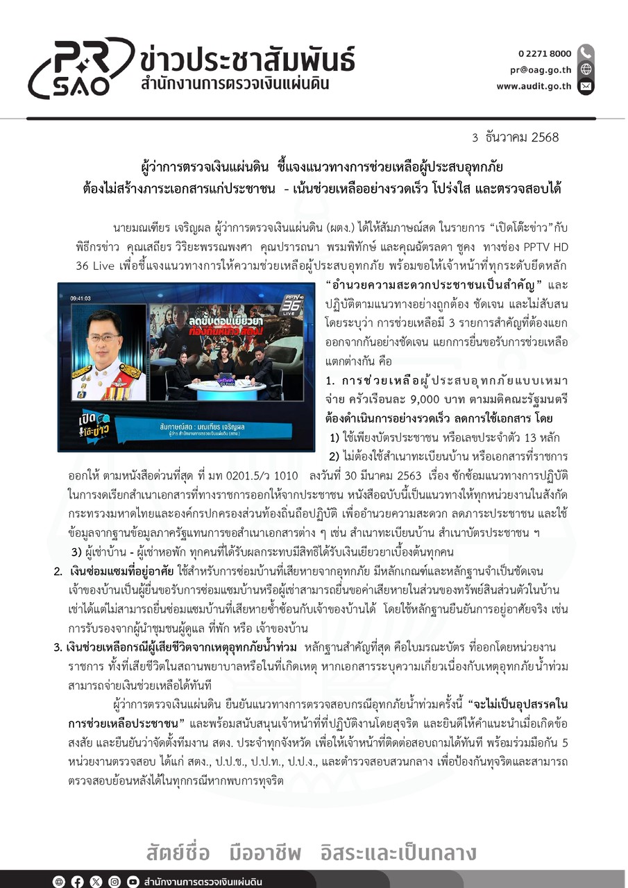 นายมณเฑียร เจริญผล ผู้ว่าการตรวจเงินแผ่นดิน ชี้แจงแนวทางการช่วยเหลือผู้ประสบอุทกภัย ต้องไม่สร้างภาระเอกสารแก่ประชาชน เน้นช่วยเหลืออย่างรวดเร็ว โปร่งใส และตรวจสอบได้ข่าวที่น่าสนใจ, ข่าวประชาสัมพันธ์ธันวาคม 3, 2025ธันวาคม 3, 2025 Post Views: 75