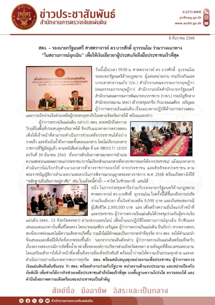 สตง. – รองนายกรัฐมนตรี ศาสตราจารย์ ดร.บวรศักดิ์ อุวรรณโณ ร่วมวางแนวทาง “ในสถานการณ์ฉุกเฉิน” เพื่อให้เงินเยียวยาผู้ประสบภัยถึงมือประชาชนเร็วที่สุดข่าวที่น่าสนใจ, ข่าวประชาสัมพันธ์ธันวาคม 8, 2025 Post Views: 54