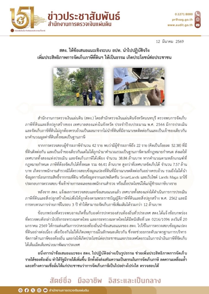 สตง. ให้ข้อเสนอแนะเชิงระบบ อปท. นำไปปฏิบัติจริง เพิ่มประสิทธิภาพการจัดเก็บภาษีที่ดินฯ ให้เป็นธรรม เกิดประโยชน์ต่อประชาชนข่าวที่น่าสนใจ, ข่าวประชาสัมพันธ์มีนาคม 12, 2026มีนาคม 12, 2026 Post Views: 34