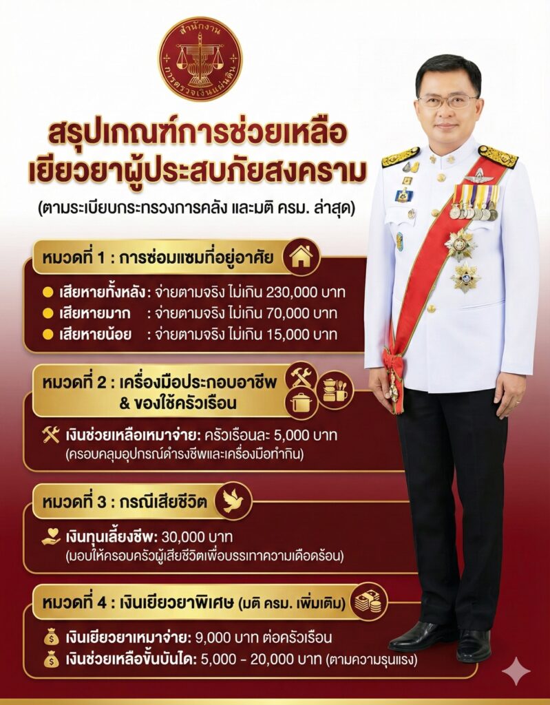 สรุปเกณฑ์การช่วยเหลือเยียวยาผู้ประสบภัยสงคราม (ตามระเบียบกระทรวงการคลัง และมติ ครม. ล่าสุด)ข่าวที่น่าสนใจ, ข่าวประชาสัมพันธ์ธันวาคม 29, 2025ธันวาคม 29, 2025 Post Views: 86